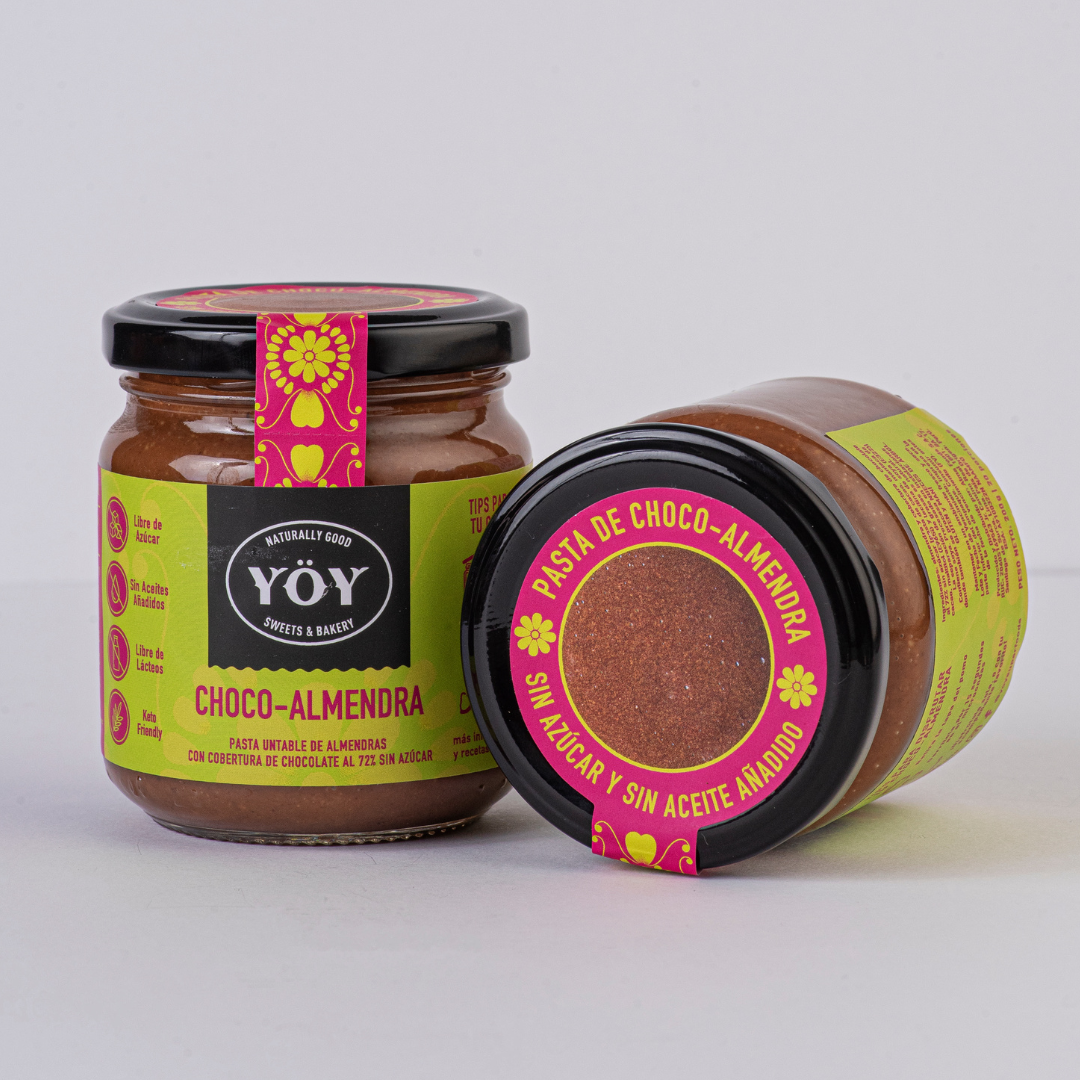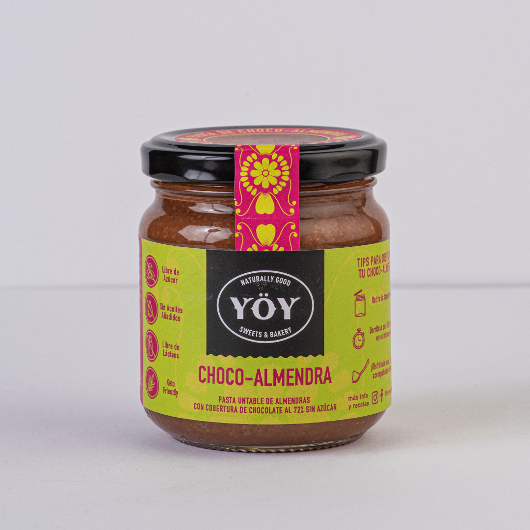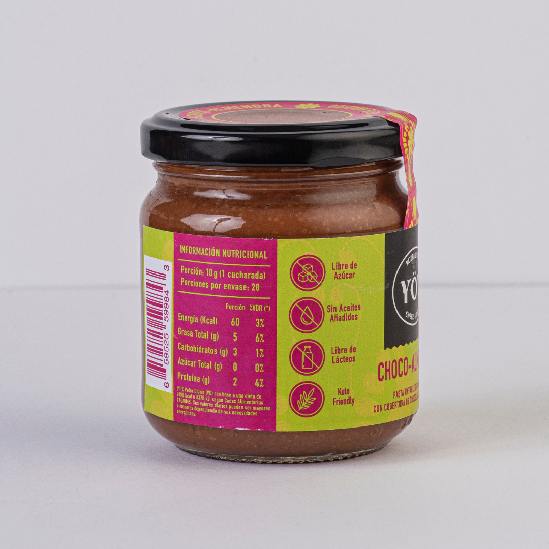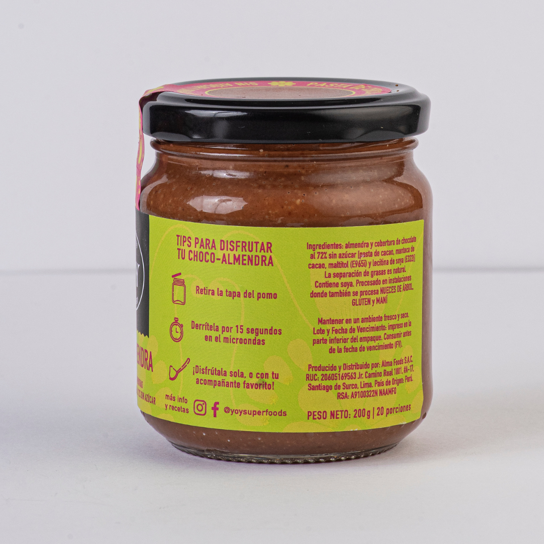 Ingredientes: almendra y cobertura de chocolate al 72% sin azúcar [pasta de cacao, manteca de cacao, maltitol (E965i) y lecitina de soya (E322)]. La separación de grasas es natural. Mezclar bien antes de consumir. Contiene SOYA.
